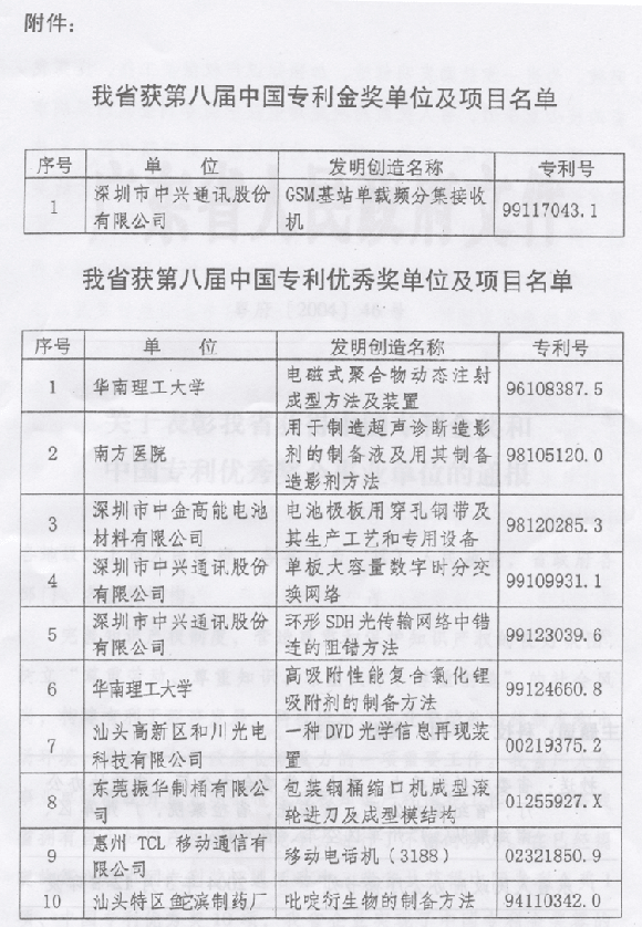 各地级以上市人民政府,各县(市、区)人民政府,省政府各部门、各直属机构: 完善知识产权制度,营造尊重和保护知识产权的良好氛围,树立“尊重劳动、 尊重知识、尊重人才、尊重创造”的社会风尚,构建有利于经济发展、科技进步、 文化繁荣的法律制度和市场环境,是我省各级政府长期致力的一项重要工作。我 省广大企事业单位积极开展发明创造活动和知识产权保护工作,为提高我省拥有 自主知识产权的核心竞争力进行了不懈的努力。在已经揭晓的第八届中国专利奖 评选活动中,我省共获得中国专利金奖1项、中国专利优秀奖10项,我省企业 实现了中国专利金奖零的突破。为进一步鼓励发明创造,加强知识产权保护工作, 提高我省的核心竞争力,省人民政府决定对荣获中国专利金奖的深圳市中兴通讯 股份有限公司给予100万元的奖励,对荣获中国专利优秀奖的华南理工大学等 10家企事业单位分别给予50万元的奖励,并在全省予以通报表彰。 希望全省广大企事业单位要以获得中国专利金奖和中国专利优秀奖的单位为 榜样,将实施知识产权战略与企业经营发展战略有机地结合起来,不断加强技术 创新和知识产权保护工作,促进我省自主知识产权产出数量和质量的提高,全面 提升我省的综合竞争力。受表彰的单位要继续发扬成绩,再接再厉,创造更多更 高技术水平的核心专利技术,为我省提高自主知识产权的核心竞争力和率先基本 实现社会主义现代化做出新的更大的贡献。 附件:我省获得第八届中国专利金奖、中国专利优秀奖单位及项目名单 正规博彩平台 二○○四年五月九日 |