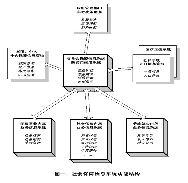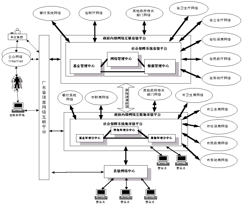 (四)系统网络结构 社会保障信息系统的网络以我省建立的全省统一网络互联大平台为基础,在 省、市级分别以政府信息网络平台为核心,通过公共通信设施连接到各有关部门。 在公共服务方面,充分利用各个公众信息网络和INTERNET资源。网络结 构如图四所示。 |