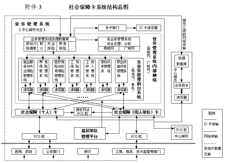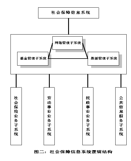 (二)系统逻辑结构 社会保障信息系统在纵向上有省、地市和县三级,横向上在省、地市级是以 基金管理子系统、网络管理子系统、数据管理子系统为核心,并与三大业务系统 相连接。另外,还有面向社会公共信息服务子系统。在县级重点是建设各个业务 子系统,并通过网络中心与地市级连接。系统的逻辑结构如图二所示。 |