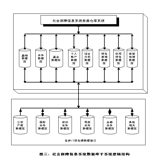 (三)系统数据仓库 社会保障信息系统数据仓库是一个统一的、综合的、分布式的大型数据仓库, 它主要包括基础数据库、社会保障业务数据库、基金数据库、个人帐户数据库、 综合分析数据库、查询数据库、宏观数据库、政策法规等八大数据库系统。数据 仓库系统构成如图三所示。 |