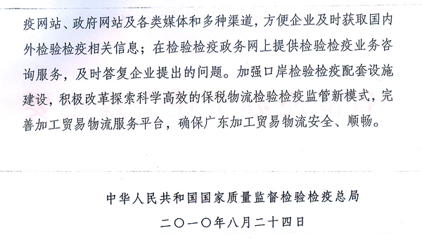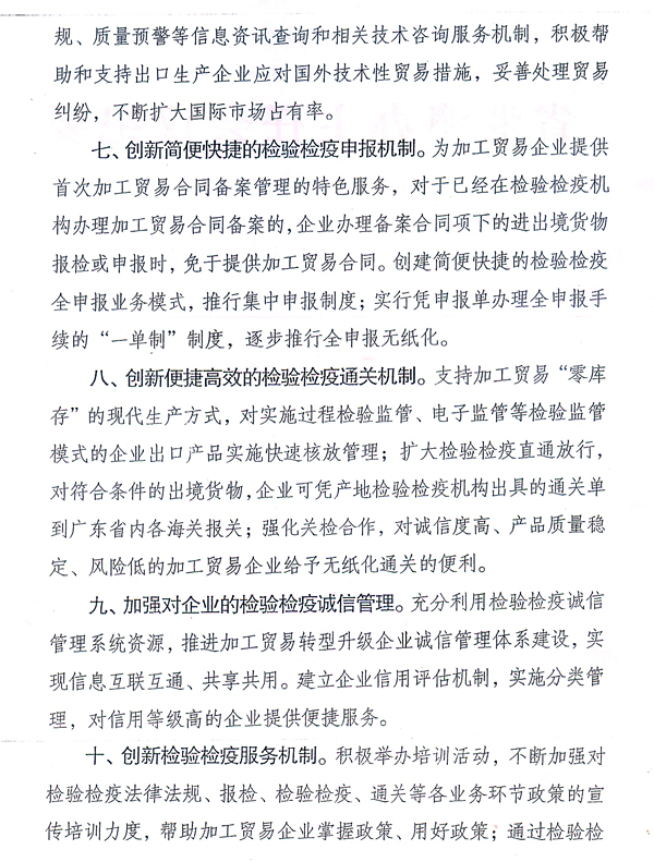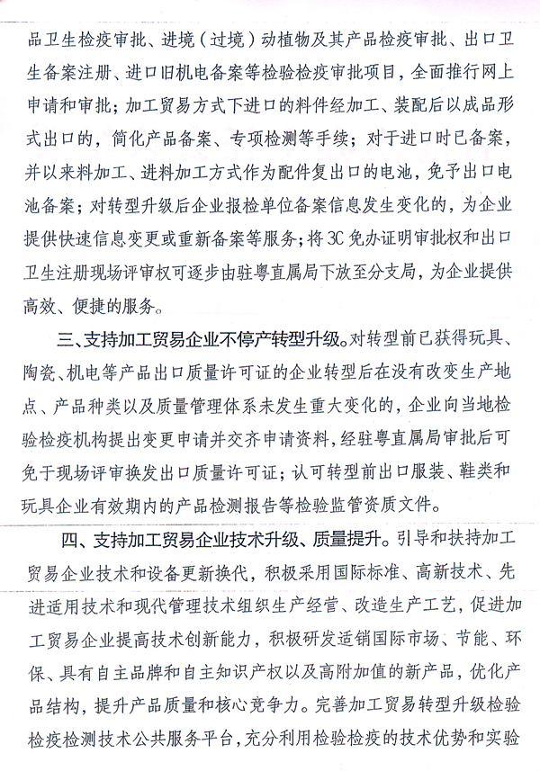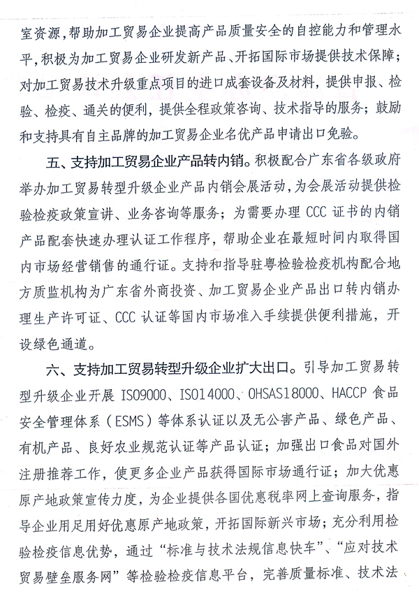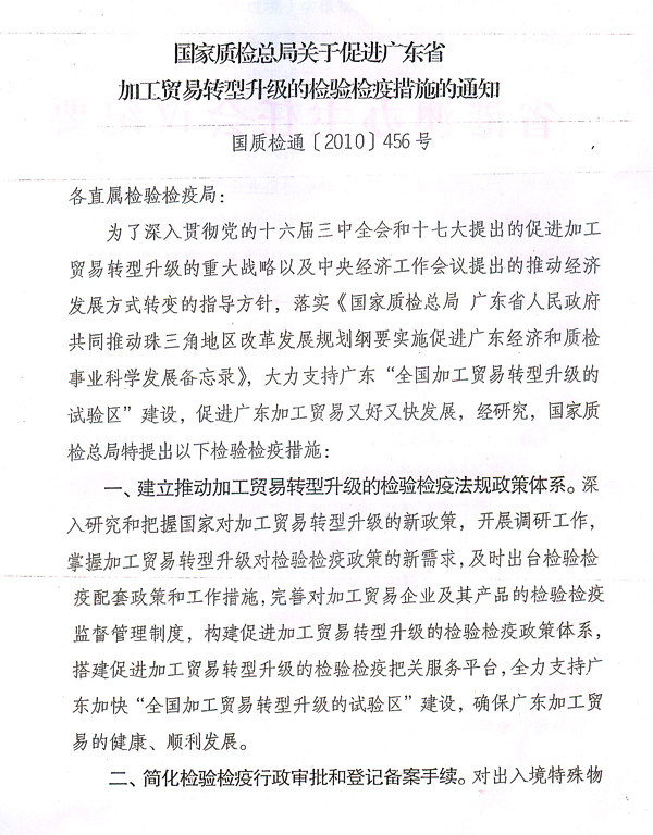 各地级以上市人民政府,省政府各部门、各直属机构: 近日,国家质检总局根据广东出入境检验检疫局调研意见,出台了《国家质检总局关于促进广东省加工贸易转型升级的检验检疫措施的通知》(国质检通〔2010〕456号),支持我省建设全国加工贸易转型升级试验区。根据省政府领导意见,现将国质检通〔2010〕456号文转发给你们,请认真组织学习宣传,配合做好相关工作。同时,各地、各部门要借鉴国家质检总局和广东出入境检验检疫局的做法,积极采取有效措施,为加工贸易企业转型升级提供优质、高效的服务。