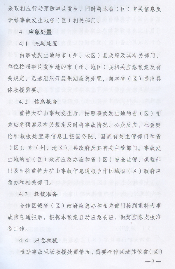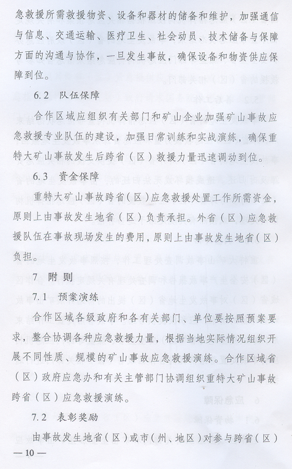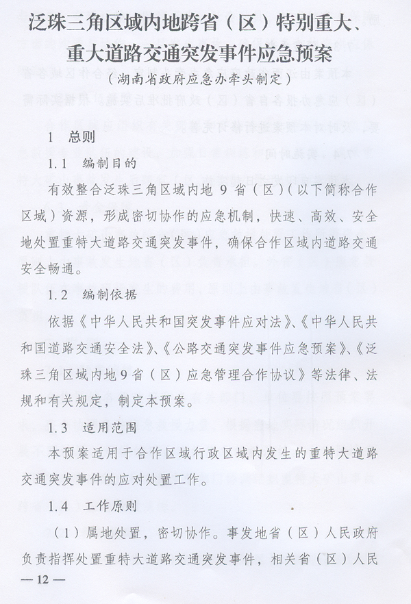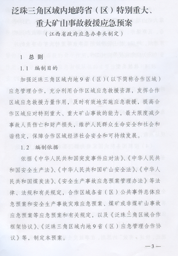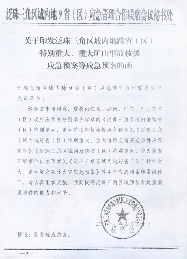 韶关、河源、梅州、湛江、茂名、肇庆、清远、潮州、云浮市人民政府,省应急委成员单位: 根据省政府领导同志意见,现将泛珠三角区域内地9省(区)应急管理合作联席会议秘书处《关于印发泛珠三角区域内地跨省(区)特别重大、重大矿山事故救援应急预案等应急预案的函》转发给你们,请结合《广东省突发事件应对条例》有关规定,抓好贯彻落实。执行中遇到的问题,请径与省政府应急办联系。