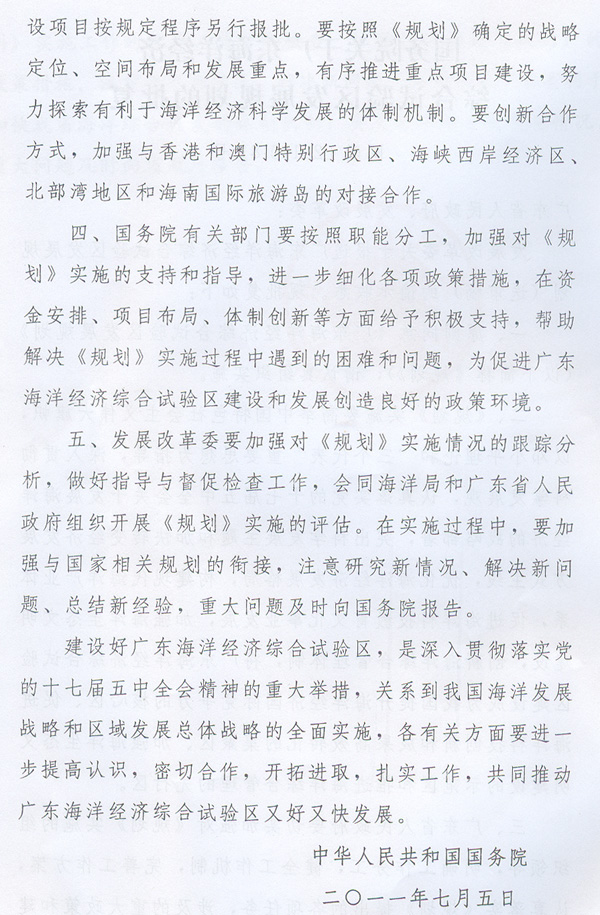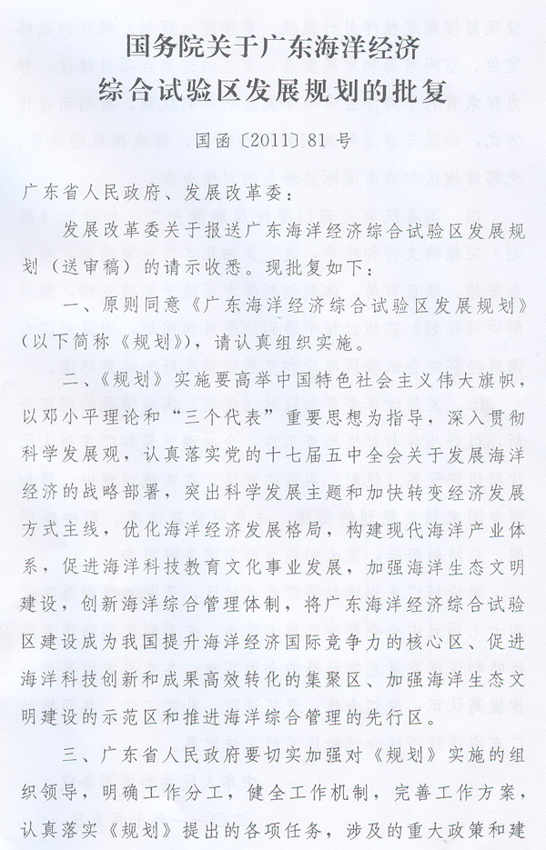 各地级以上市人民政府,各县(市、区)人民政府,省政府各部门、各直属机构: 现将《国务院关于广东海洋经济综合试验区发展规划的批复》(国函〔2011〕81号)转发给你们,请遵照执行。 《广东海洋经济综合试验区发展规划》(以下简称《规划》)是继《珠江三角洲地区改革发展规划纲要(2008-2020年)》之后,推动我省经济社会发展的又一国家层面的规划,为我省探索海洋开发新途径和海洋综合管理新模式,加快海洋经济发展,建设海洋经济强省,争当全国海洋事业发展排头兵创造了新的重大机遇。各地、各有关部门要高度重视,把实施《规划》作为“加快转型升级、建设幸福广东”的重要举措,结合本地区、本部门实际,科学谋划,精心部署,采取有效措施,推动我省海洋经济加快发展。省发展改革委要会同省海洋渔业局加强对《规划》实施工作的指导、监督和检查,抓紧制定实施《规划》的政策措施,注重研究新情况、解决新问题,加快建立完善有利于加快我省海洋综合开发的体制机制;要及时跟踪分析实施情况,重大问题及时向省政府报告。