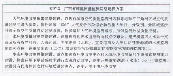 3.提升环境应急监测能力。 按照国家环境应急能力建设标准要求,全面提升省环境监测中心和区域环境监测站的应急监测能力,形成“以省级站为龙头、区域站为骨干、市级站为支撑”的环境应急监测网络,建立完善上下联动、合作紧密的环境应急监测工作机制,打造一支应急监测快速反应队伍,增强各类环境突发事件的快速应对能力,到2015年基本建成全方位、多层次、广覆盖的环境监测预警体系。 (二)提升环境执法监督能力。 1.大力推进环境监察机构标准化建设。 大力推进各地特别是各县(市、区)环境监察机构能力建设,到2015年,所有地级以上市环境监察机构实现全面达标,县级环境监察机构标准化建设硬件达标率达70%以上(其中珠江三角洲地区达90%以上,其他地区达60%以上)。大力开展环境监察人员业务培训,打造一支思想好、作风正、懂业务、能战斗、会管理的环境执法队伍,全面提升环境执法水平和突发环境事件应对能力。 2.完善重点污染源在线监控系统。 推动重点污染源在线监控系统建设,力争在“十二五”期间国、省控重点污染源全部实现在线监控,完成所有在线监控设备的安装改造和验收,做好氨氮和氮氧化物的在线监测和数据传输工作,强化设备运行维护,强化对自动监控系统数据有效性的审核,推进污染源自动监控设施社会化运营。 3.加强机动车污染监管能力建设。 加快各地工况法检测线和抽检能力建设,鼓励有条件的城市开展遥测法抽检。加快全省机动车排气检测数据库建设,实现机动车排气检测信息的互联共享,为机动车污染监管提供支撑服务平台。 4.加强固体废物监管能力建设。 完善固体废物管理体系,鼓励地级以上市设立专门的固体废物管理机构,有条件的县(市、区)配备固体废物管理专职人员,充实固体废物管理队伍。加快全省固体废物管理信息系统的使用推广,提高对固体废物产生、收集、运输和处理处置全过程的信息化监管水平。 (三)提高核与辐射安全监管能力。 全面推进省、市级核与辐射环境监测、监察能力建设,到2015年,省环境辐射监测中心达到全国先进水平,珠海、韶关、江门、阳江等重点地区市级核与辐射环境监测、监察能力全面达标。加快建设省控核与辐射在线自动监测网络,实现核与辐射环境监测的自动化和网络化,提高监测效率。加强对核电站毗邻海域海洋环境中核与辐射监测,重点加强省级和深圳、江门、阳江等市海洋环境核与辐射监测能力建设。配套完善核事故后果评价和信息管理系统以及各类核与辐射基础数据库,全面提升核与辐射安全和应急管理水平。 (四)提升环境信息化水平。 重点推进县级环境信息机构标准化建设。到2015年,地级以上市环境信息机构达标率达90%,县级环境信息机构达标率达60%以上,各地级以上市、县(市、区)全部实现联网,基本建成省市县一体、功能完善、互联互通、覆盖全省的环境信息网络平台。加快推进集环境质量、污染减排、环境统计、污染源普查、建设项目审批、固体废物管理等信息于一体的数据中心建设,实现省与各地之间、各城市之间、各部门之间、政府与企业之间环境信息资源的共建共享。全面推进省、市、县三级主要环保业务管理的信息化,提升全省环境信息化服务整体水平。 (五)加强环境宣教能力建设。 加强环境宣教机构特别是地级以上市环境宣教机构的标准化建设,逐步推进县级环境宣教队伍建设,到2015年,省级和80%的地级以上市宣教机构达到标准化建设要求,县级环境宣教队伍建设达标率达50%.加强环境保护职业技术学院、环境教育馆、社区环境文化宣传橱窗等环境科普阵地建设,建立健全新闻发言人制度,建立上下协调的环境宣传教育网络平台。 八、创新机制与政策,提升环境保护综合管理水平 (一)提高环保综合决策与协调能力。 1.建立健全环境与发展综合决策机制。 加强环境与发展综合决策机制建设,加强对环境与发展重大政策的研究,协调解决重大环境问题。探索实行重大经济决策(政策)出台前的环境影响评价制度,充分发挥环境保护对经济发展的优化作用。建立由多学科专家组成的环境与发展咨询机制,对经济与社会发展的重大决策、规划实施以及重大开发建设活动可能带来的环境影响进行充分论证,为决策提供科学依据。 2.落实政府环保目标责任制。 强化主要污染物总量减排考核,严格落实污染减排问责制和一票否决制。完善环境保护目标责任制考核,把环境保护作为领导班子和领导干部政绩考核的重要内容,定期考核,并作为干部选拔任用和奖惩的重要依据之一。建立环境保护责任追究制度,对因决策失误、未正确履行职责、监管不到位等问题,造成人民群众利益受到侵害、生态环境受到严重破坏、环境质量明显恶化等后果的,依法依纪追究有关人员责任。 (二)推进环保法规体系建设。 1.完善环境法规体系。 修订完善现有地方性法规规章,建立与国家法律法规相衔接的地方环境保护法规体系。适时提请修订《广东省环境保护条例》,进一步明确各级政府在环境保护工作中的责任,建立完善排污许可证发放、污染源在线监控、排污权有偿使用和交易、企业环境信用管理、环境污染责任保险、环境公益诉讼等制度。适时提请修订《广东省东江水系水质保护条例》和《广东省珠江三角洲水质保护条例》,加快制订《珠江三角