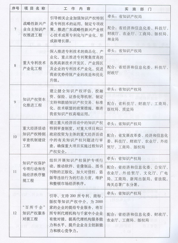 一、发展基础与形势……………………………………………………………(1) (一)发展基础 ………………………………………………………………(1) 1.确立了知识产权强省建设目标………………………………………………(1) 2.制定了实施知识产权战略纲要………………………………………………(1) 3.知识产权政策法规体系不断完善……………………………………………(2) 4.知识产权数量和质量跃上新台阶……………………………………………(2) 5.知识产权运用能力持续增强…………………………………………………(3) 6.知识产权保护力度不断加大…………………………………………………(3) 7.知识产权管理水平和服务能力不断提高……………………………………(4) (二)发展形势 ………………………………………………………………(5) 1.国际形势………………………………………………………………………(5) 2.国内形势………………………………………………………………………(5) (三)面临的挑战 ……………………………………………………………(6) 1.体制与机制改革有待进一步深化……………………………………………(6) 2.知识产权创造能力亟需全面提高……………………………………………(6) 3.知识产权转化运用亟待着力推进……………………………………………(6) 4.知识产权结构和区域发展不平衡……………………………………………(7) 二、指导思想和发展目标 …………………………………………………(7) (一)指导思想 ………………………………………………………………(7) (二)发展目标 ………………………………………………………………(8) 三、主要任务……………………………………………………………………(9) (一)激励知识产权创造,全面增强自主创新能力 ………………………(10) 1.完善自主创新激励机制………………………………………………………(10) 2.突显企业主体地位和作用……………………………………………………(10) 3.提高产业自主创新能力………………………………………………………(10) 4.提升高校与科研机构创造能力………………………………………………(11) (二)促进知识产权运用,引领建立现代产业体系 ………………………(11) 1.着力推动产业结构优化升级…………………………………………………(11) 2.加快推进知识产权转化和运用………………………………………………(12) 3.积极推进专利技术标准化工作………………………………………………(12) 4.培育具有核心竞争力的知名品牌……………………………………………(13) 5.大力实施“版权兴业工程”…………………………………………………(13) 6.积极促进植物新品种应用……………………………………………………(13) 7.推进传统知识产权化与产业化………………………………………………(13) (三)加强知识产权保护,维护公平竞争市场秩序 ………………………(14) 1.健全知识产权保护机制………………………………………………………(14) 2.加大知识产权行政执法力度…………………………………………………(14) 3.加强知识产权刑事执法工作…………………………………………………(15) 4.提升知识产权司法审判水平…………………………………………………(15) 5.强化会展和行业协会知识产权保护…………………………………………(15) 6.加强地理标志产品保护工作…………………………………………………(16) 7.建立维权援助和涉外应对机制………………………………………………(16) (四)优化知识产权管理,营造良好的发展环境 …………………………(16) 1.健全知识产权管理体制………………………………………………………(16) 2.推行知识产权特别审查制度…………………………………………………(17) 3.推进企业知识产权规范管理…………………………………………………(17) 4.加强代理机构与人员管理……………………………………………………(17) 5.强化生物物种遗传资源管理…………………………………………………(17) 6.加强知识产权对外交流与合作………………………………………………(17) (五)强化知识产权服务,促进创新型广东建设 …………………………(17) 1.培育和发展知识产权服务业…………………………………………………(18) 2.规范知识产权服务市场………………………………………………………(18) 3.推动中介机构与创新主体对接………………………………………………(18) 4.提高知识产权综合信息服务能力……………………………………………(18) (六)弘扬知识产权文化,营造良好的知识产权文化氛围 ………………(19) 1.积极推进知识产权文化建设工程……………………………………………(19) 2.广泛开展知识产权宣传活动…………………………………………………(19) 3.积极开展知识产权培训教育工作……………………………………………(19) 四、保障措施……………………………………………………………………(20) (一)加强组织领导 …………………………………………………………(20) (二)加大投入力度 …………………………………………………………(20)