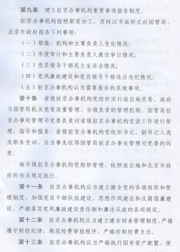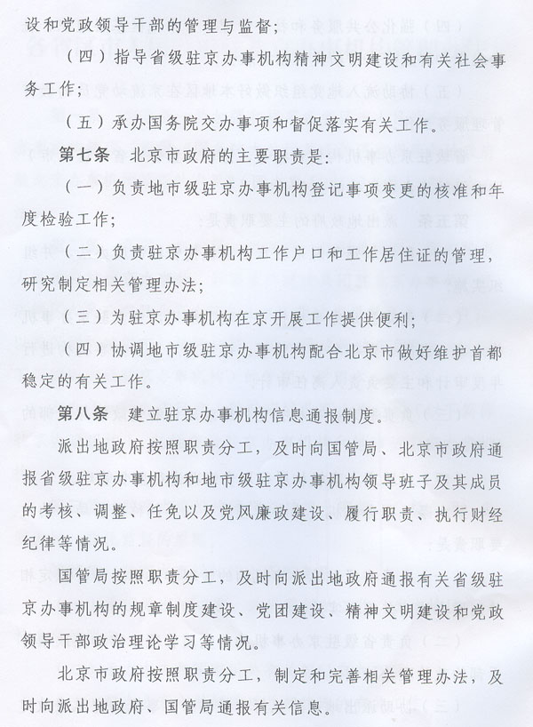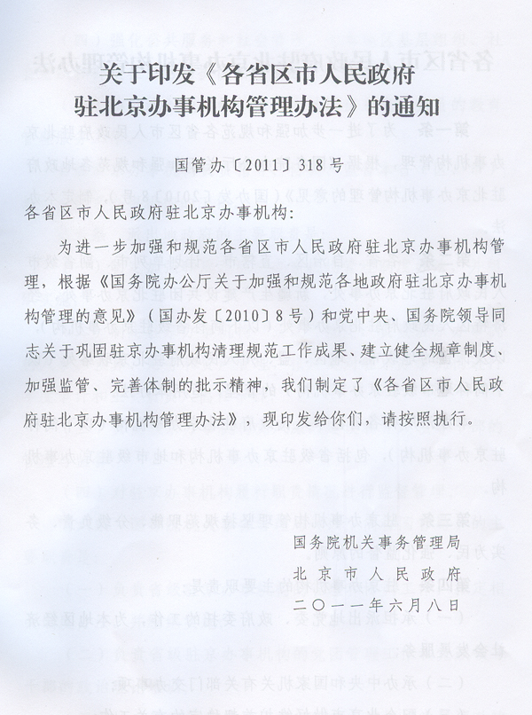 各地级以上市人民政府,顺德区人民政府,省直有关单位: 经省人民政府同意,现将国务院机关事务管理局、北京市人民政府《关于印发〈各省区市人民政府驻北京办事机构管理办法〉的通知》(国管办〔2011〕318号,以下简称《管理办法》)转发给你们,结合我省实际提出如下意见,请一并贯彻执行。 一、我省各驻京办事机构要认真贯彻落实《管理办法》的各项工作要求,切实做到规范职能、廉洁从政、务实为民,不断强化公共服务和社会管理职能。要建立重要事项报告制度,健全党的各级组织和管理制度,完善财务和资产管理制度,严格执行党政机关公务接待管理规定。要加强与国务院机关事务管理局、北京市人民政府的沟通协调,努力在推动地区间协作、服务本地区经济社会发展、处置突发事件、维护首都稳定等方面发挥更加积极有效的作用。 二、设有驻京办事机构的地级以上市人民政府和顺德区人民政府,要切实履行监督管理职责,按照《管理办法》的要求,研究制订并组织实施加强和规范本地区驻京办事机构管理的制度办法,制订和落实驻京办事机构“三定”方案,严格执行党风廉政建设责任制,加强驻京办事机构人事、预算、财务和资产管理,按规定开展相关审计工作。要及时向国务院机关事务管理局、北京市人民政府和省政府驻京办通报驻京办事机构人事工作、履行职责、党风廉政建设等方面的情况。省政府办公厅将另行制订加强和规范驻京办事机构管理的制度办法。 三、省驻京办要切实加强对我省各驻京办事机构的指导、协调、监督,统筹全省在京资源,形成工作合力;要按照《关于同意成立中共广东省驻北京机构委员会的批复》(粤组党〔2010〕14号)的要求,抓紧推进中共广东省驻北京机构委员会组建工作。各驻京办事机构要加强与省驻京办的沟通联系,及时将处置突发事件、信访维稳及廉政建设等方面的情况报送省驻京办,并积极配合省驻京办做好相关工作。