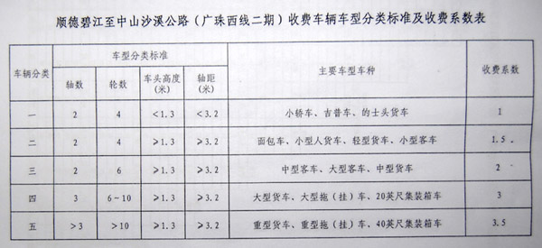 省交通运输厅、物价局: 粤交费〔2010〕358号请示收悉。省人民政府同意顺德碧江至中山沙溪公路(广珠西线二期)交工验收通车和收费站收费设施经验收符合省联网收费技术要求后开始收费,收费车型按全省高速公路统一标准,即按车辆轴(轮)数及车头高度等物理参数进行分类,一至五类车收费系数分别是1、1.5、2、3、3.5;收费标准为0.6元/标准车公里。