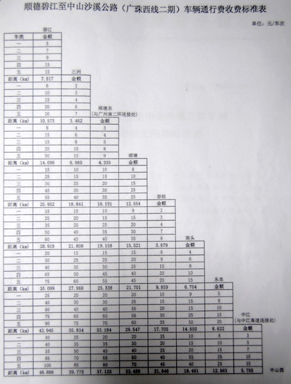 关于顺德碧江至中山沙溪公路车辆 通行费有关问题的复函
