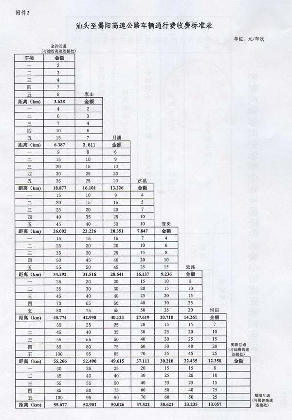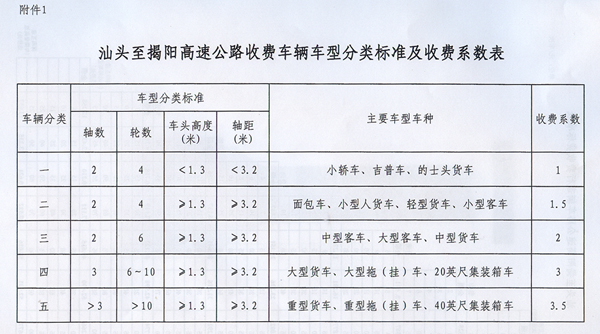 附件:1.汕头至揭阳高速公路收费车辆车型分类标准及收费系数表 2.汕头至揭阳高速公路车辆通行费收费标准表