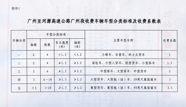 省交通运输厅、物价局: 粤交费〔2011〕1123号请示收悉。省人民政府同意广州至河源高速公路广州段交工验收通车和收费站收费设施经验收符合省联网收费技术要求后开始收费,收费车型按全省高速公路统一标准,即按车辆轴(轮)数及车头高度等物理参数进行分类,一至五类车的收费系数分别为1、15、2、3、35;收费标准为0.6元/标准车公里。