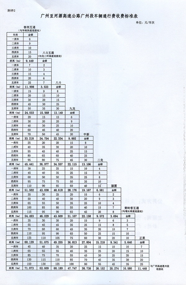 附件:1.广州至河源高速公路广州段收费车辆车型分类标准及收费系数表 2.广州至河源高速公路广州段车辆通行费收费标准表 正规博彩平台办公厅 二○一一年十二月十三日