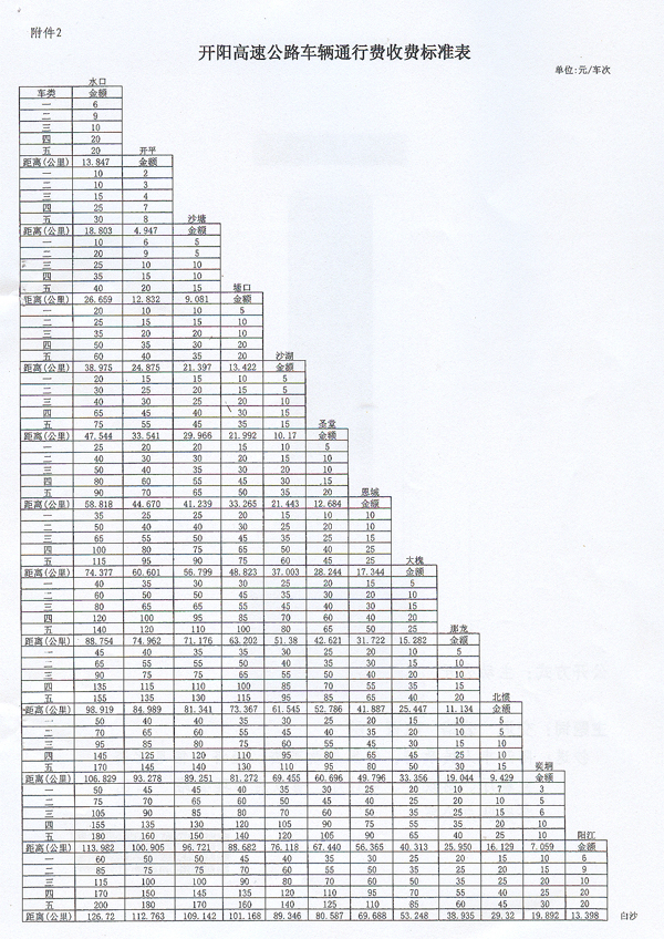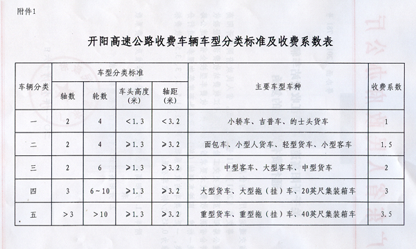 附件:1.开阳高速公路收费车辆车型分类标准及收费系数表 2.开阳高速公路车辆通行费收费标准表