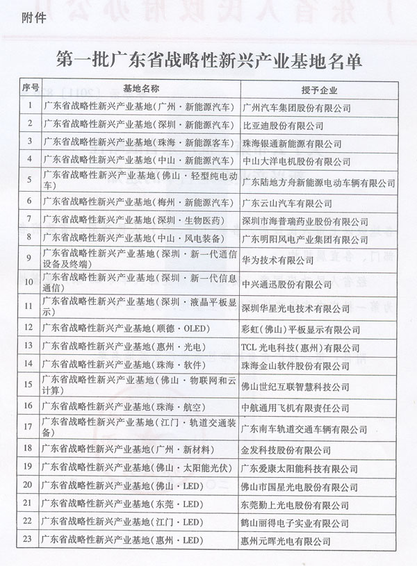 各地级以上市人民政府,各县(市、区)人民政府,省政府各部门、各直属机构: 经省人民政府同意,确定广州新能源汽车等23家产业基地为第一批广东省战略性新兴产业基地,现予公布。