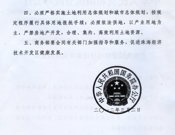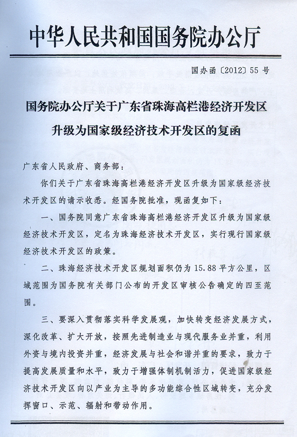 珠海市人民政府: 现将《国务院办公厅关于广东省珠海高栏港经济开发区升级为国家级经济技术开发区的复函》(国办函〔2012〕55号) 转发给你们,请按照办理。