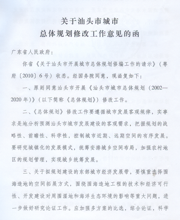 汕头市人民政府,省住房城乡建设厅: 现将住房和城乡建设部《关于汕头市城市总体规划修改工作意见的函》(建规函〔2012〕42号)转发给你们,请遵照实施。