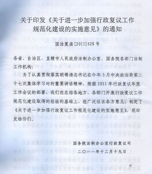 转发国务院法制办关于进一步加强行政复议 工作规范化建设实施意见的通知