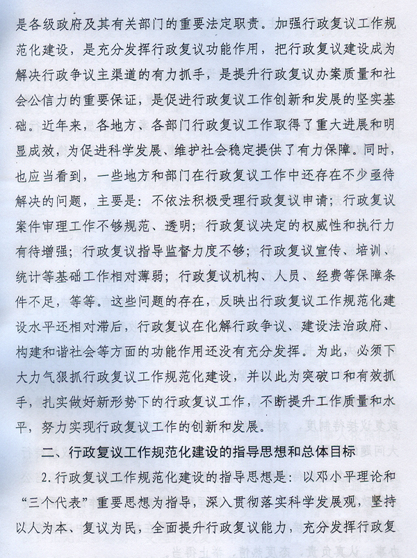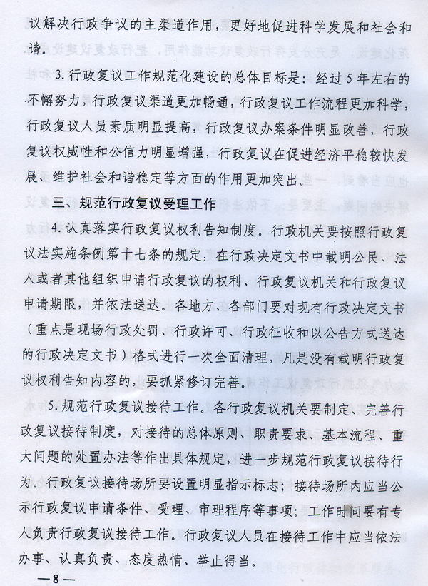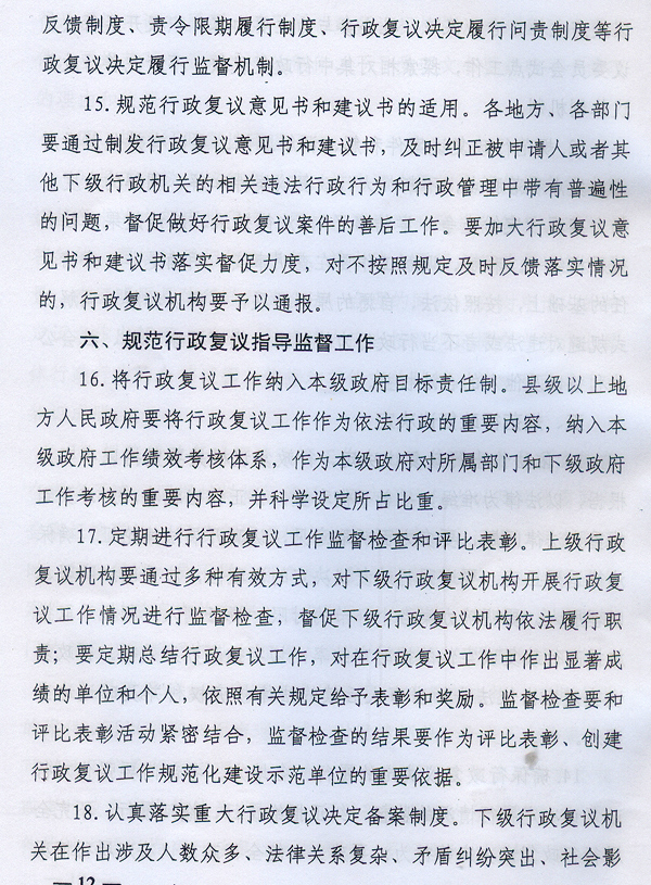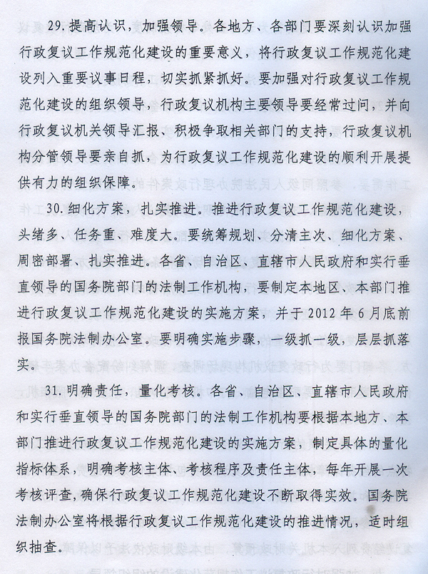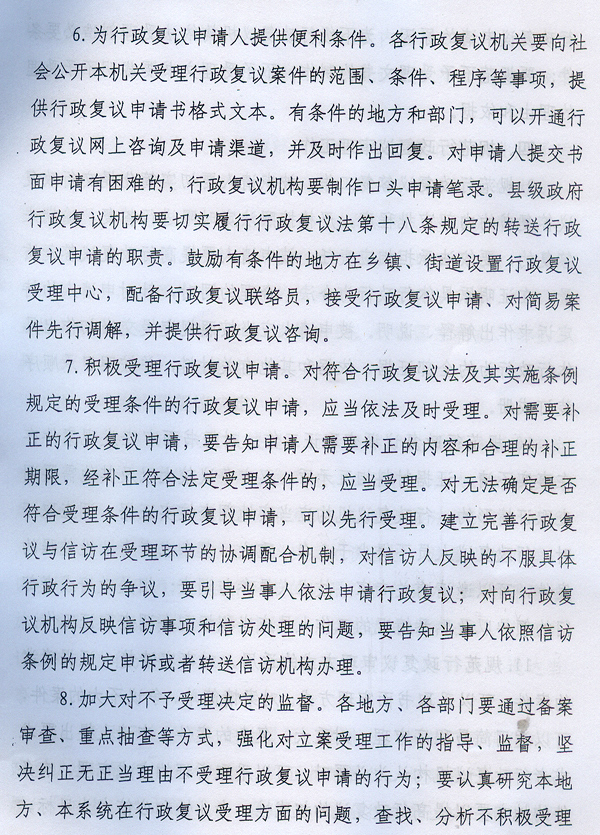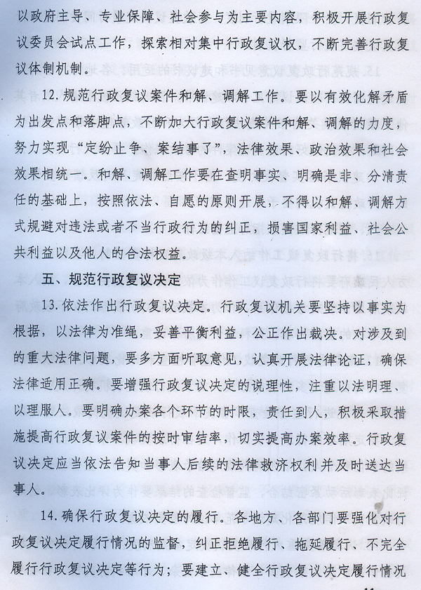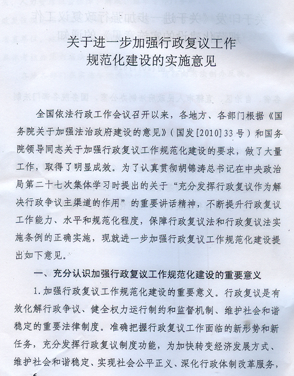 各地级以上市人民政府,各县(市、区)人民政府,省政府各部门、各直属机构: 行政复议是有效化解行政争议、健全权力运行制约和监督机制、维护社会和谐稳定的重要法律制度。近年来,我省行政争议引发的行政复议案件大幅增加。为进一步加强新形势下的法制工作,充分发挥行政复议作为解决行政争议主渠道的作用,提升行政复议工作规范化程度及其权威性和公信力,经省人民政府同意,现将国务院法制办公室《关于进一步加强行政复议工作规范化建设的实施意见》(国法复函〔2011〕628号,以下简称《意见》)转发给你们,并结合实际提出以下意见,请一并贯彻执行。 一、加强行政复议工作规范化建设 各地各部门要按照《意见》要求,狠抓行政复议案件的受理、审理、调解、决定、履行等工作规范化建设。规范行政复议案件受理,各地级以上市、县(市、区)政府要创造条件设立行政复议受理窗口,畅通复议渠道;要完善行政复议与信访衔接机制,把符合行政复议受理范围的信访事项引导到行政复议渠道解决。规范行政复议案件审理,根据案件不同情况采取适当的审理方式,对行政复议案件审理要重证据、重依据、重程序,坚持公开、公平、公正,当事人双方提出异议的要组织质证;开展政府主导、专业保障、社会参与的行政复议委员会试点工作。规范行政复议案件调解,以有效化解行政争议为目标,对群体性重大案件坚持全程调解,力争将矛盾纠纷化解在行政复议环节,实现“案结事了”。规范行政复议案件决定,坚持以事实为根据、法律为准绳,确保法律适用正确和公正处理,对违法或者不当的具体行政行为,该撤销的坚决予以撤销,该确认违法的坚决确认违法。规范行政复议案件履行,健全行政复议决定执行问责等监督机制,切实纠正拒绝履行、拖延履行行政复议决定等行为。 二、加强行政复议制度建设 省法制办要尽快制定《广东省行政复议工作规范化建设实施细则》,完善行政复议立案、受理、审查、听证、简易程序、调解和解等具体制度。各地各部门要结合实际,完善本地区、本部门相关配套制度,为行政复议规范化建设提供制度保障。落实报告备案制度,各地行政复议机构每年要将本地区行政复议应诉案件综合分析报告上报本级政府;对社会影响较大的重大疑难案件,要及时报告本级政府。 三、加强行政复议队伍建设和办案保障 健全行政复议机构,地级以上市政府负责法制工作的机构要明确承担行政复议工作的内设机构;加强行政复议队伍建设,保证审理行政复议案件有2名以上行政复议人员参加。各地级以上市、县(市、区)政府要结合案件数量及行政复议工作需要,配备、充实、调剂专职行政复议人员,确保人员配备与工作任务相适应。推动行政复议培训工作经常化、制度化,力争3年内将全省行政复议人员轮训一遍。各地要将行政复议专项经费列入财政预算,切实保障行政复议机构办理行政复议案件所必需的工作场所和车辆、器材等设备设施。加强行政复议工作信息化建设,提高全省行政复议应诉案件管理系统运作水平。加强行政复议统计分析工作,提高分析的准确性、时效性、科学性。 四、加强行政复议工作的组织领导和考核检查 各地各部门要将行政复议工作规范化建设纳入年度工作计划,统一部署,认真抓好落实。各地级以上市、县(市、区)政府要建立健全行政复议工作责任制,将行政复议工作作为依法行政的重要内容,纳入本级政府目标责任制考核。由法制部门牵头,人力资源社会保障、财政、监察等部门参加,适时对全省行政复议规范化建设工作进行考核检查。省负责考核地级以上市和省直单位,地级以上市负责考核所属县(市、区)和市直单位。具体考核办法由省法制办制定。 各地各部门在实施中遇到的问题,请径向省法制办反映。
