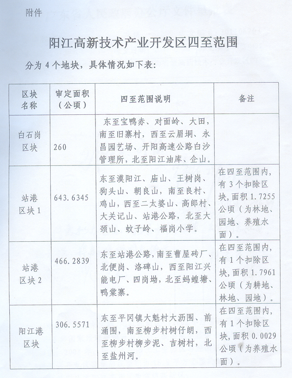 阳江市人民政府: 阳府〔2011〕22号请示收悉。经省人民政府同意,现函复如下: 一、省人民政府同意认定广东阳江工业园区和广东阳江港经济开发区内16764755公顷区域为省级高新技术产业开发区,定名为阳江高新技术产业开发区,实行现行省级高新技术产业开发区政策。 二、阳江高新技术产业开发区区域范围在国家有关部门公告确定的广东阳江工业园区和广东阳江港经济开发区四至范围内,分为4个区块(四至范围详见附件)。 三、阳江高新技术产业开发区必须严格实施土地利用总体规划和城市总体规划,按规定履行具体用地报批手续,依法供地,切实做到合理、集约、高效利用土地资源。 四、阳江高新技术产业开发区要加快发展高新技术产业和高附加值服务业,突出主导产业,延伸优化产业链条,进一步集聚自主创新资源,提升产业竞争力和自主创新能力,充分发挥辐射和示范带动作用。 五、你市要加强指导和服务,促进阳江高新技术产业开发区健康发展。