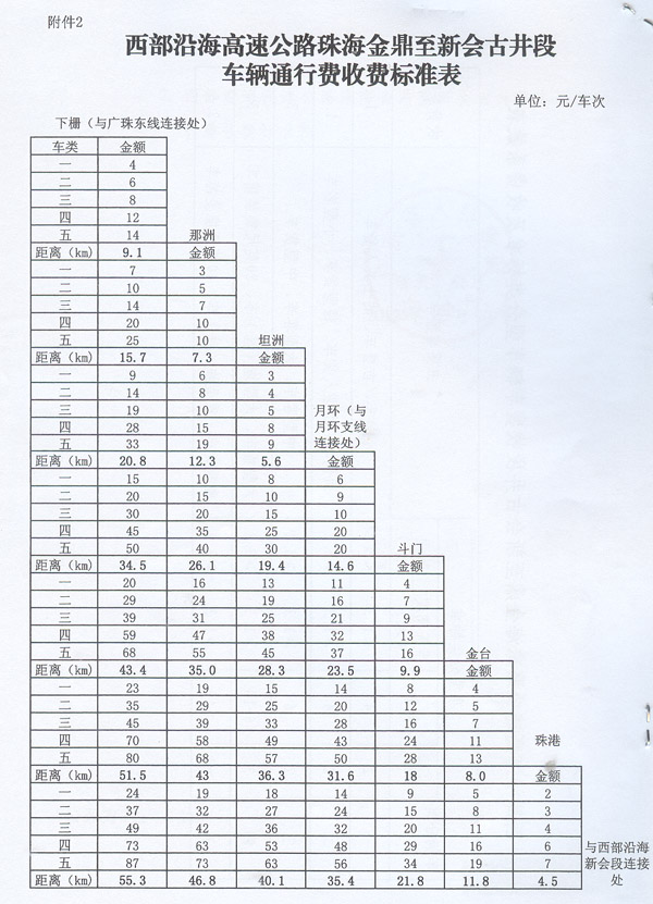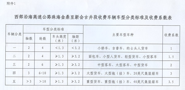 附件:1.西部沿海高速公路珠海金鼎至新会古井段收费车辆车型分类标准及收费系数表 2.西部沿海高速公路珠海金鼎至新会古井段车辆通行费收费标准表