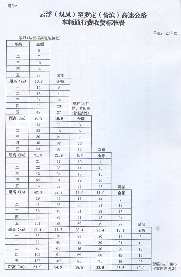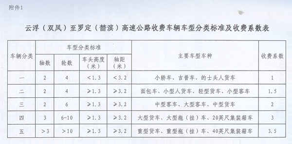 附件:1.云浮(双凤)至罗定(榃滨)高速公路收费车辆车型分类标准及收费系数表 2.云浮(双凤)至罗定(榃滨)高速公路车辆通行费收费标准表