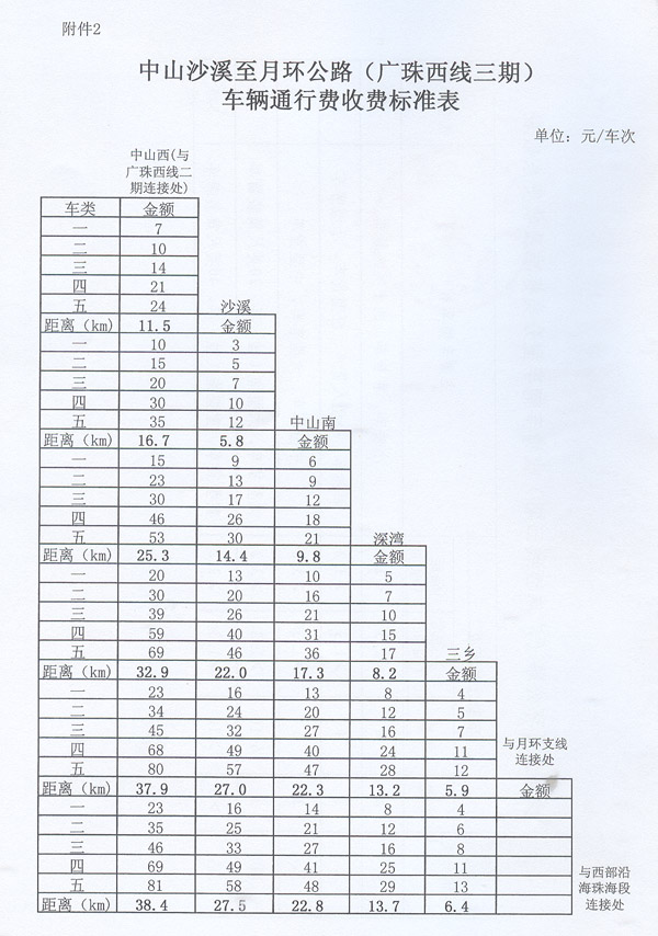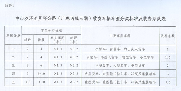 附件:1.中山沙溪至月环公路(广珠西线三期)收费车辆车型分类标准及收费系数表 2.中山沙溪至月环公路(广珠西线三期)车辆通行费收费标准表