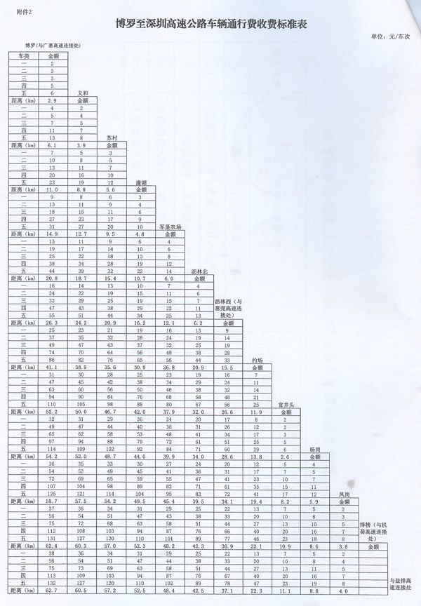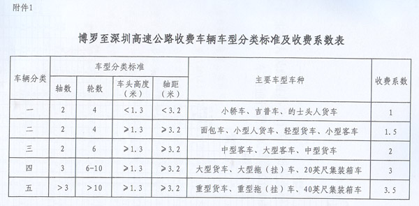 附件:1.博罗至深圳高速公路收费车辆车型分类标准及收费系数表 2.博罗至深圳高速公路车辆通行费收费标准表