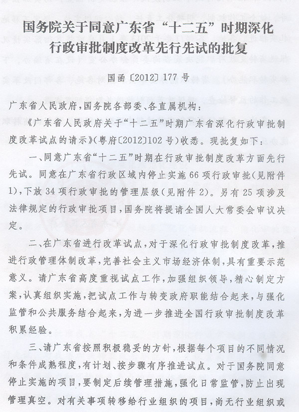 正规博彩平台转发《国务院关于同意 广东省“十二五”时期深化行政审批 制度改革先行先试的批复》的通知