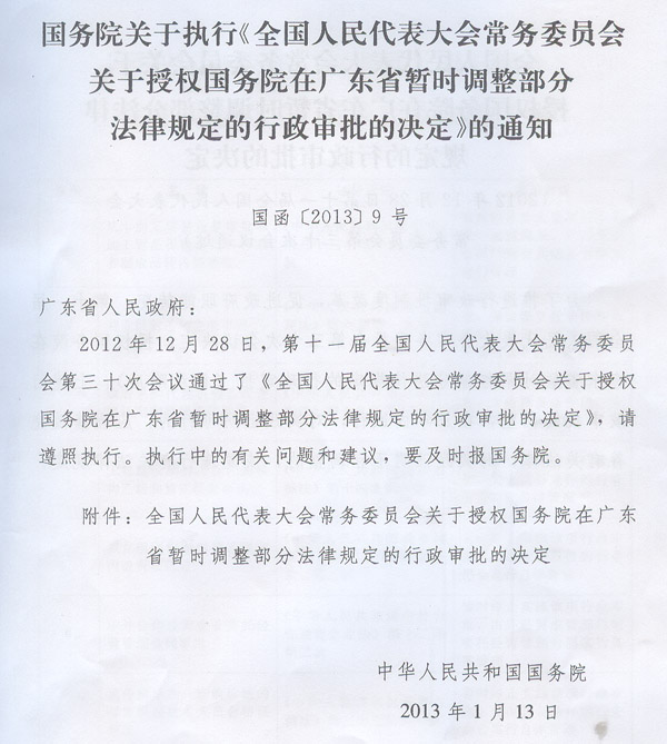 现将《国务院关于执行〈全国人民代表大会常务委员会关于授权国务院在广东省暂时调整部分法律规定的行政审批的决定〉的通知》(国函〔2013〕9号)转发给你们,请认真贯彻执行。
