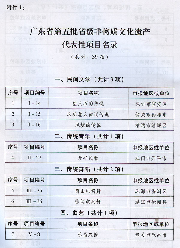 正规博彩平台关于批准并公布广东省 第五批省级非物质文化遗产名录的通知