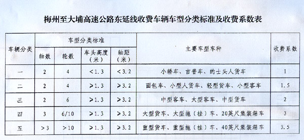 粤交费〔2014〕656号请示收悉。同意梅州至大埔高速公路东延线交工验收通车和收费站收费设施经验收符合省联网收费技术要求后开始收费,收费车型按全省高速公路统一标准,即按车辆轴(轮)数及车头高度等物理参数进行分类,一至五类车的收费系数分别为1、1.5、2、3、3.5;收费标准为0.45元/标准车公里。