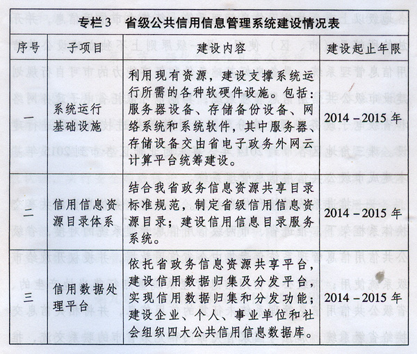 ——统筹建设全省公共信用信息管理系统。遵循统一规划、分级负责、一数一源的原则,按照统一的信息标准、技术规范和安全等级,依托全省政务信息资源共享交换体系,实现省、市两级信用信息交换和共享。到2015年,建成覆盖全省的省、市两级联通的公共信用信息管理系统。制定省、市公共信用信息管理系统管理制度和考核办法,明确落实系统建设、运行维护、应用管理职责。