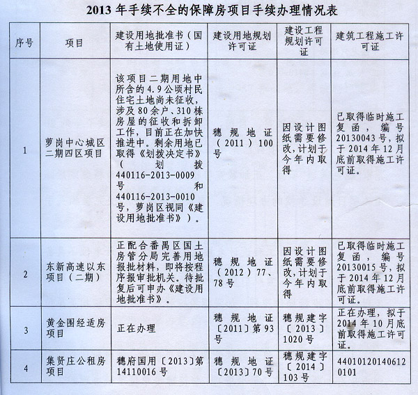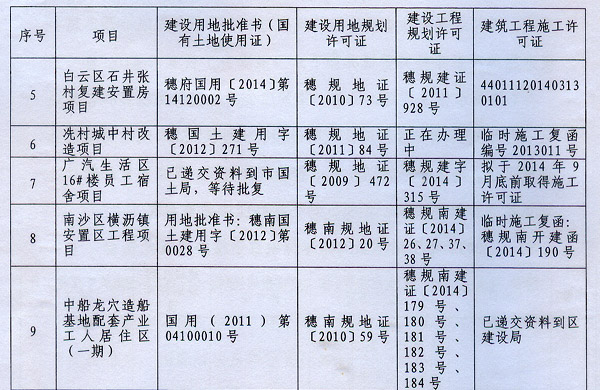 1.广州市相关项目。目前,集贤庄公共租赁住房项目和白云区石井张村复建安置房项目已取得国有土地使用证、建设用地规划许可证、建设工程规划许可证和施工许可证,其余项目正按计划抓紧完善报建手续。各项目的手续办理情况见下表: