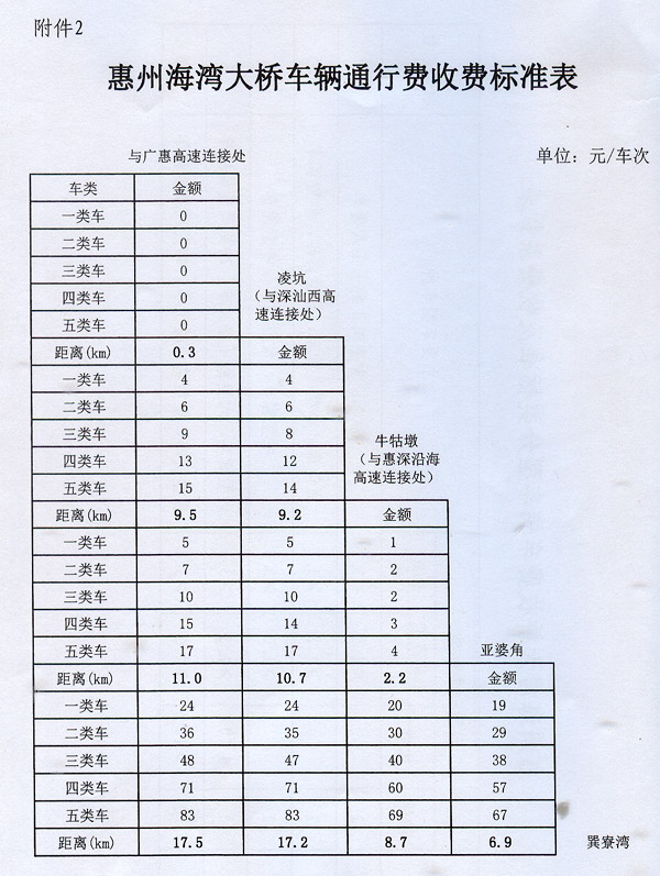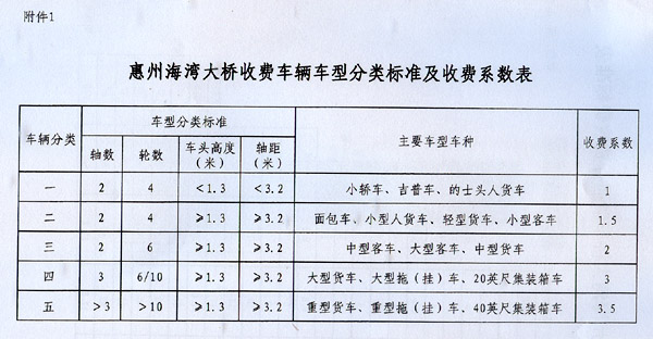 粤交费〔2014〕1649号请示收悉。同意惠州海湾大桥项目建成通车和收费站收费设施经验收符合省联网收费技术要求后开始收费,收费车型按全省高速公路统一标准,即按车辆轴(轮)数及车头高度等物理参数进行分类,一至五类车的收费系数分别为1、1.5、2、3、3.5;凌坑至船澳段收费标准为0.45元/标准车公里,船澳至赤沙段收费标准为19元/标准车次。