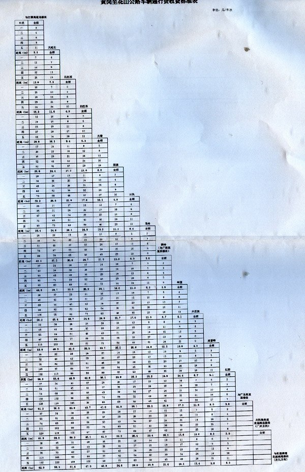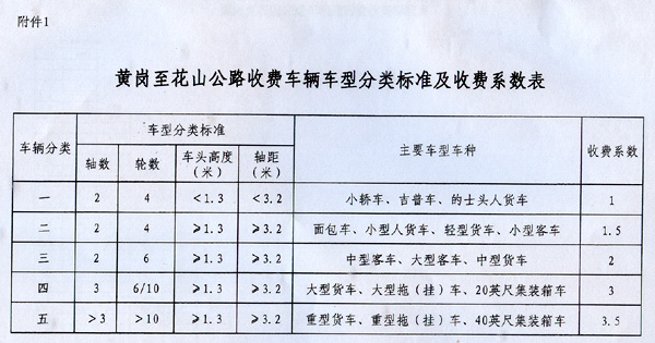 粤交费〔2014〕1455号请示收悉。同意黄岗至花山公路建成通车和收费站收费设施经验收符合省联网收费技术要求后开始收费,收费车型按全省高速公路统一标准,即按车辆轴(轮)数及车头高度等物理参数进行分类,一至五类车的收费系数分别为1、1.5、2、3、3.5;收费标准为0.6元/标准车公里。