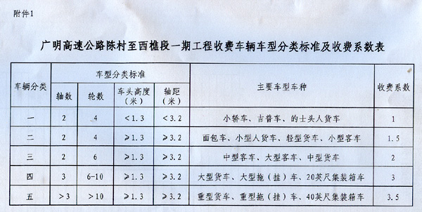粤交费〔2014〕1681号请示收悉。同意广明高速公路陈村至西樵段一期工程建成通车和收费站收费设施经验收符合省联网收费技术要求后开始收费,收费车型按全省高速公路统一标准,即按车辆轴(轮)数及车头高度等物理参数进行分类,一至五类车的收费系数分别为1、1.5、2、3、3.5,收费标准为0.6元/标准车公里。