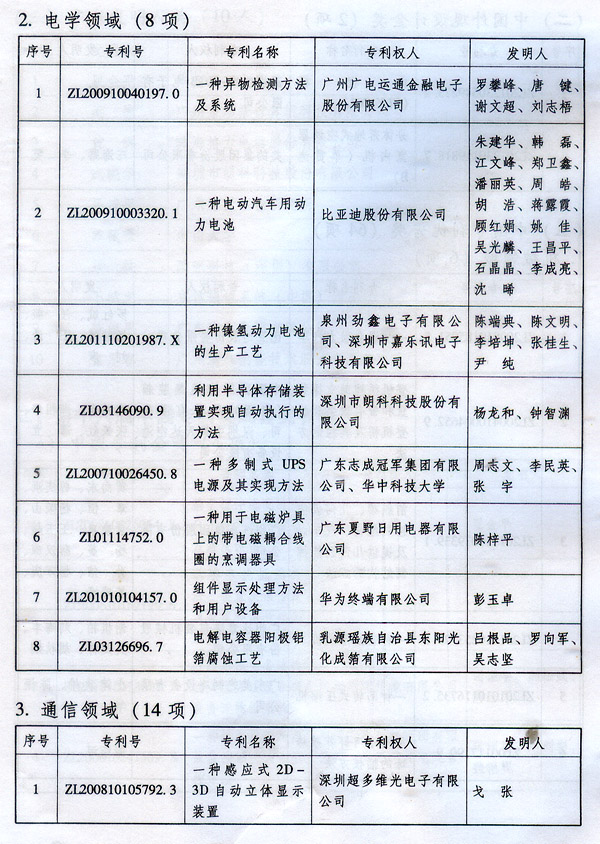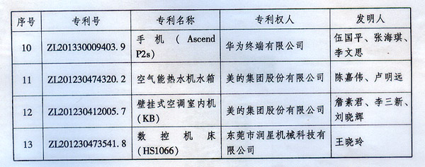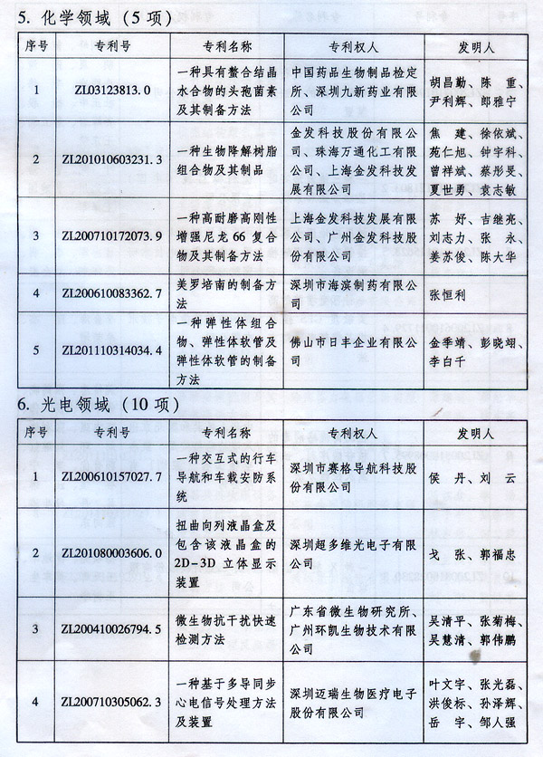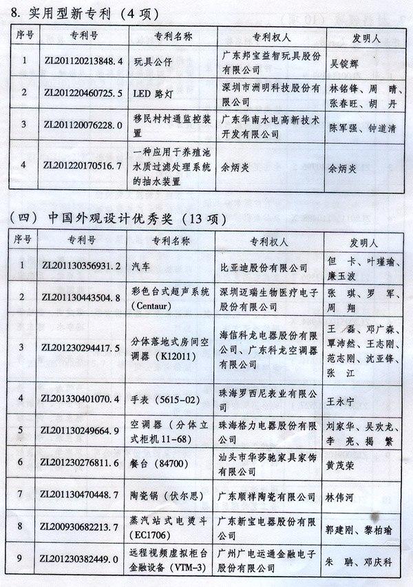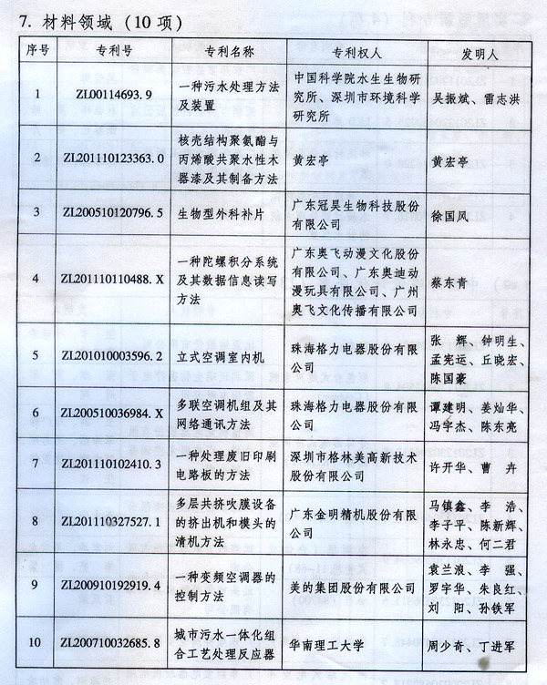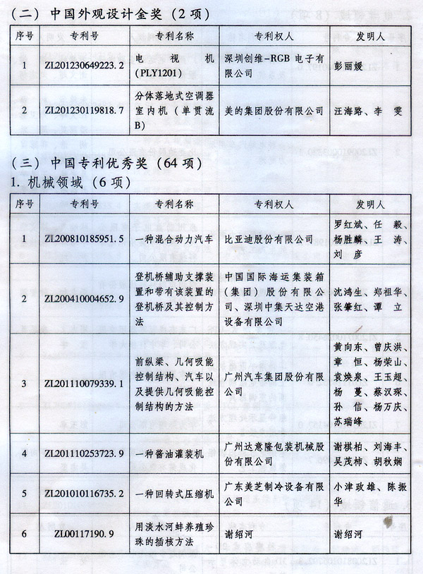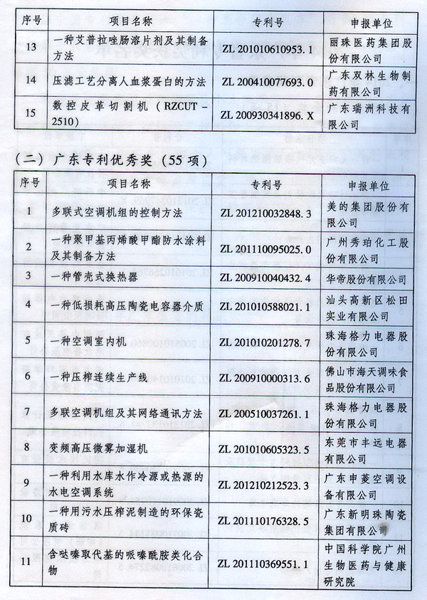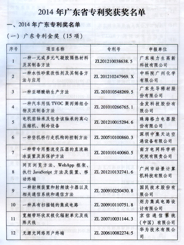 各地级以上市人民政府,各县(市、区)人民政府,省政府各部门、各直属机构: 根据《广东省专利奖励办法》(粤府令第202号规定),经广东专利奖评审委员会评审,省知识产权局审核,省政府决定授予“一种一元或多元气凝胶隔热材料及其制备方法”等15项专利为2014年广东专利金奖,给予每项10万元的奖励;授予“多联式空调机组的控制方法”等55项专利为2014年广东专利优秀奖,给予每项5万元的奖励;授予瞿金平等10位发明人2014年广东发明人奖,给予每人2万元的奖励;对我省获得第十六届中国专利金奖的“基于拉伸流变的高分子材料塑化输运方法及设备”等4项专利、获得第十六届中国外观设计金奖的“电视机(PLY1201)”等2项专利给予每项100万元奖励,对我省获得第十六届中国专利优秀奖的“一种混合动力汽车”等64项专利、获得第十六届中国外观设计优秀奖的“汽车”等13项专利给予每项50万元奖励。