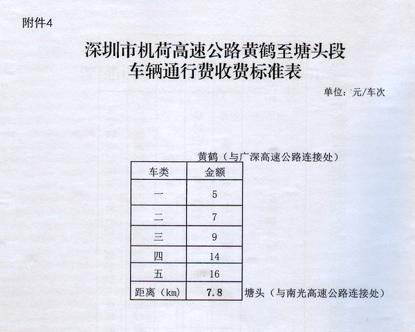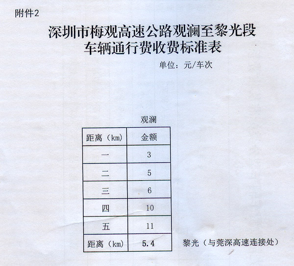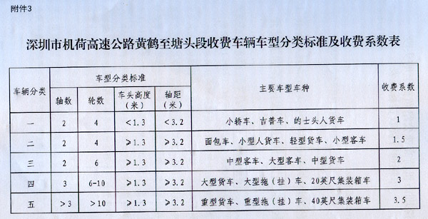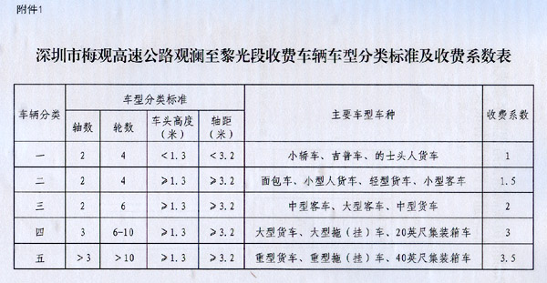 2.深圳市梅观高速公路观澜至黎光段车辆通行费收费标准表 3.深圳市机荷高速公路黄鹤至塘头段收费车辆车型分类标准及收费系数表 4.深圳市机荷高速公路黄鹤至塘头段车辆通行费收费标准表