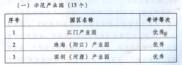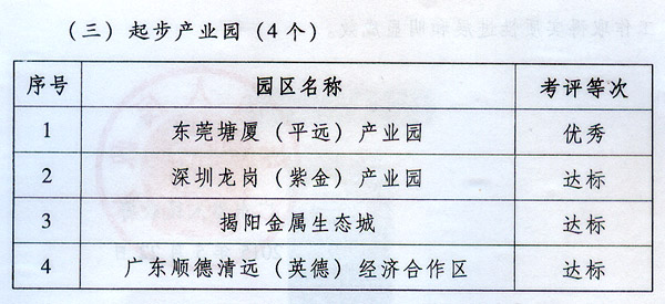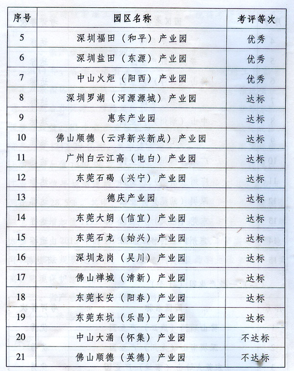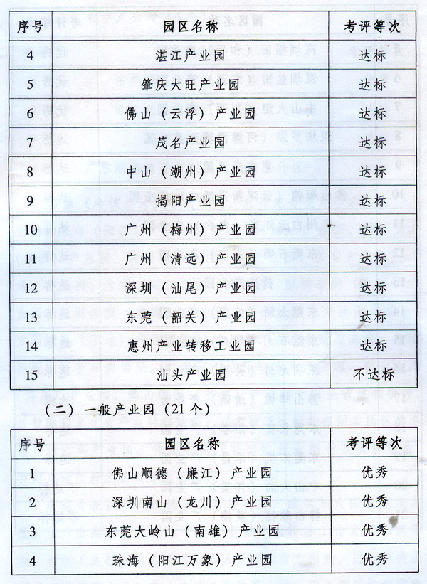 正规博彩平台关于2014年度 省产业园建设管理考评情况的通报 各地级以上市人民政府,各县(市、区)人民政府,省政府各部门、各直属机构: 为贯彻落实《中共广东省委正规博彩平台关于进一步促进粤东西北地区振兴发展的决定》(粤发〔2013〕9号)、《中共广东省委办公厅正规博彩平台办公厅关于印发促进粤东西北地区产业园区扩能增效工作方案的通知》(粤办发〔2013〕22号),深入推进我省产业转移工作,促进省产业转移工业园(以下简称产业园)扩能增效,按照《正规博彩平台办公厅关于印发广东省产业园建设管理考核评价办法的通知》(粤办函〔2014〕23号,以下简称《考核办法》)的规定,省经济和信息化委会同省发展改革委、财政厅、人力资源社会保障厅、国土资源厅、环境保护厅、住房城乡建设厅、统计局等单位对2014年度省产业园建设管理工作进行考核评价。现将考评情况通报如下: 一、省产业园扩能增效工作总体进展顺利 2014年,各地、各有关部门按照省委、省政府工作部署,加大产业园区扩能增效工作力度,在完善基础建设、推进项目落地、创新合作共建、节约集约利用土地和加强环境保护等方面取得较好成效。40个省产业园新建、续建工业项目合计完成固定资产投资1242.29亿元,其中设备投资451.66亿元;实现规模以上工业增加值1449.96亿元,同比增长20.3%,是全省规模以上工业增加值平均增速的2.42倍;实现全口径税收226.7亿元,同比增长28.5%。其中,粤东西北地区34个省产业园实现规模以上工业增加值1122.43亿元,占粤东西北地区规模以上工业增加值比重由2013年的17.3%提高为19.1%。认真落实有关用地、环保政策法规规定要求,园区土地节约集约利用水平进一步提高,环境保护措施落实更加到位。 按照《考核办法》有关规定,对评定为优秀等次的江门产业园、珠海(阳江)产业园、深圳(河源)产业园、佛山顺德(廉江)产业园、深圳南山(龙川)产业园、东莞大岭山(南雄)产业园、珠海(阳江万象)产业园、深圳福田(和平)产业园、深圳盐田(东源)产业园、中山火炬(阳西)产业园、东莞塘厦(平远)产业园等11个园区予以全省通报表扬,并按照规定给予相应奖励。对考评不达标的汕头产业园、中山大涌(怀集)产业园、佛山顺德(英德)产业园予以全省通报批评,并暂停其享受省产业转移政策;对考核不达标并在同类园区排名最后的汕头产业园、佛山顺德(英德)产业园予以黄牌警告,并对当地政府主要领导进行约谈。