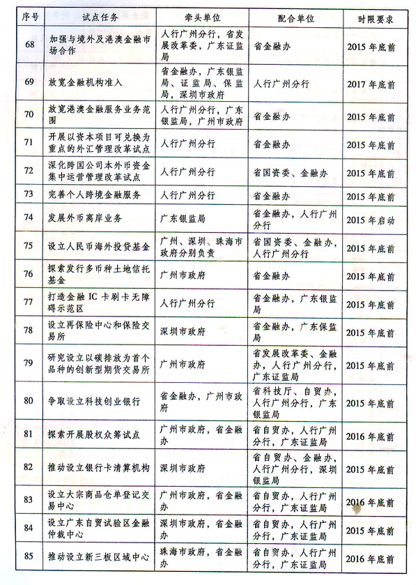 (七)深化金融领域开放创新。 围绕人民币国际化、资本项下放开、利率和汇率市场化改革,积极推进广东自贸试验区在跨境人民币业务创新、促进投融资及汇兑便利化、深化粤港澳金融合作、打造全国性和区域性重大金融平台等方面先行先试,建设人民币离岸业务在岸结算交易中心,构建以人民币结算为主的大宗商品和碳要素交易平台,探索金融产品交易的负面清单管理措施,巩固和提升粤港澳区域在人民币国际化中的战略地位,构建与国际规则接轨的金融服务体系。