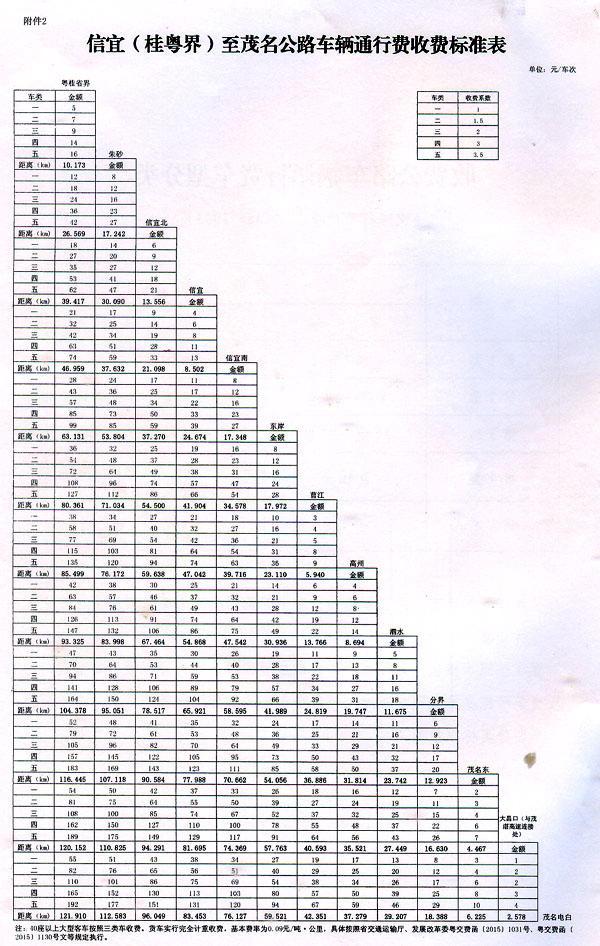 粤交费〔2015〕1200号请示收悉。同意信宜(桂粤界)至茂名公路建成通车和收费站收费设施经验收符合省联网收费技术要求后开始收费,收费车型按国家统一标准进行分类,一至五类车的收费系数分别为1、1.5、2、3、3.5,收费标准为0.45元/标准车公里;货车实行完全计重收费,基本费率为0.09元/吨·公里。