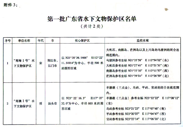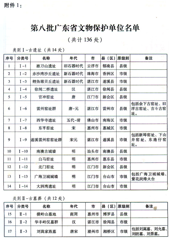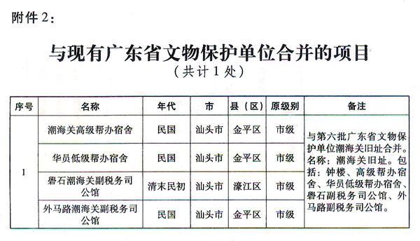 根据《中华人民共和国文物保护法》有关规定和第八批广东省文物保护单位和第一批广东省水下文物保护区评估委员会评估意见,省人民政府同意省文化厅确定的第八批广东省文物保护单位(共计136处)和第一批广东省水下文物保护区(共计2处),现予以公布。各地、各部门要按照国家和省有关法规和政策要求,认真贯彻落实“保护为主、抢救第一、合理利用、传承发展”的工作方针,切实做好文物的保护、利用和管理工作。 2.与现有广东省文物保护单位合并的项目 3.第一批广东省水下文物保护区名单