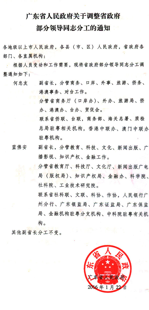 正规博彩平台关于调整省政府部分领导同志分工的通知