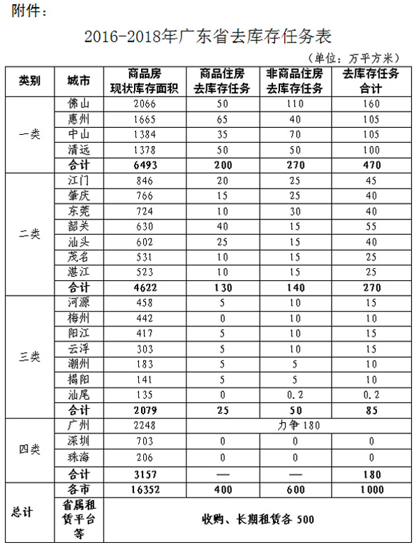 ——去库存方面。到2018年底,全省商品房库存规模比2015年底的1.6亿平方米减少约12.5%,即在全部消化2016—2018年供应溢出约630万平方米商品房的基础上,力争再化解2000万平方米的商品房库存。其中各城市负责化解1000万平方米商品房库存,通过搭建市场化、专业化、规模化住房租赁平台等,再化解1000万平方米商品房库存。各地级以上市商品住房去库存周期基本控制在16个月以内,非商品住房去库存周期明显缩短。