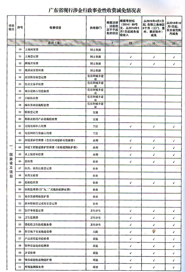 3.加快实施省定涉企行政事业性收费“零收费”。对省定11项涉企行政事业性收费,在粤财综〔2014〕89号文规定免征其中特种作业安全技术考试费、IC卡道路运输电子证件工本费、劳动合同文本费、职业病诊断及鉴定费、河道管理范围占用费等5项省定项目省级收入的基础上,从2016年4月1日起,广州、深圳、珠海、佛山、东莞、中山等6市一并免征其市县级收入,同时对占用利用公路路产补(赔)偿费、村镇基础设施配套费、绿化补偿费、恢复绿化补偿费、船舶排筏过闸费和专利纠纷案件处理费等其余6项省定项目,同步免征其省级及市县级收入;从2016年10月1日起,其他市县也按上述规定实施,全面实现省定涉企行政事业性收费“零收费”。(省发展改革委、财政厅,各地级以上市政府)