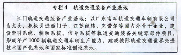 江门市重点发展城际和城市轨道车辆的制造、保养以及大、中修业务,加快研发生产具有自主知识产权的新车型,创设城际轨道交通装备国家标准,实现和谐号动车组多元化发展。积极引进相关配套企业,重点发展转向架、牵引系统、制动系统、信号系统、通讯系统等轨道交通装备关键配套产品。