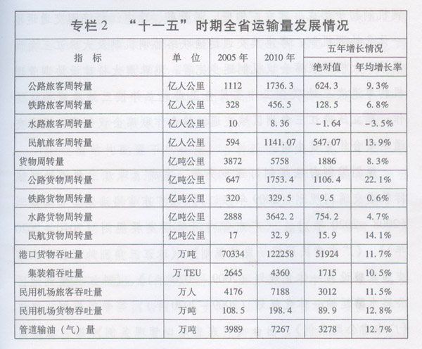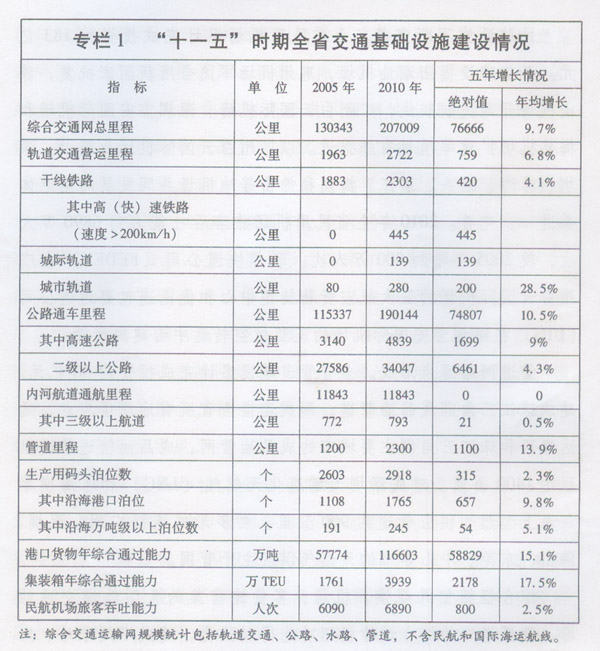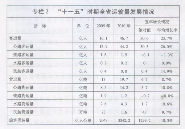 2.运输服务水平稳步提升。 运输一体化加速推进。毗邻地级以上市公交互联互通和短途客运班车公交化改造扎实推进。全省提前3年完成撤销政府还贷二级公路收费站任务。广佛肇、珠中江经济圈实现车辆通行费年票互认互通,全省公交“一卡通”工作全面展开。广州港与虎门港初步实现引航一体化。不同运输方式之间的衔接进一步增强。 运输装备水平大幅提升。广深铁路建成我国第一条客货分线运输的四线电气化铁路,客运列车实现完全公交化运营;武广客运专线开通运营,成为世界上第一条时速350公里的无砟轨道长大客运专线。公路客运车辆继续向节能环保、高级化迈进,货运车辆逐步向重型化、专用化和厢式化发展,在营运客车、危险品运输车辆快速推广安装带有卫星定位功能的汽车行驶记录仪。营运船舶向标准化、大型化和专业化发展,淘汰老、旧、小落后船舶2000多艘,乡镇渡口木质、水泥渡船基本完成更新改造。 运输保障能力全面提高。培育了一批大型客、货运输企业,内河船舶经营向公司化、专业化发展。运输安全预防监控和应急保障体系逐步完善,克服2008年初特大雨雪冰冻灾害所带来的极端困难,圆满完成春运、广州亚运会、亚残运会交通运输及安保任务。初步建立高速公路收费站节假日“保畅通”长效机制和全省统一汽车维修救援服务网络信息平台。 城乡公交服务能力日臻完善。城市公交服务水平进一步提高,全省有5个地级以上市城区的万人公共汽车拥有量超过10标台,广州、深圳市初步形成了以大运量快速轨道交通为骨干,常规公共交通为主体,出租汽车等方式为补充的城市公共交通系统。公共交通和农村客运基本公共服务均等化工作稳步推进,珠江三角洲地区基本形成城区、跨镇和镇内有效衔接的城乡一体化公共交通网络;东西北地区初步形成以城区为主,不断向周边延伸的城乡便捷客运网络。至2010年底,全省具备安全通行客运班车道路条件的行政村班车通达率达到95%,比2005年增长15.8%,农村客运候车亭和招呼站点数比2005年增长约15倍。 运输信息化应用稳步推进。初步建成全省公众出行服务信息系统和道路运政管理系统,实现道路运输证、从业人员资格证应用IC卡电子证件,并与交通运输部联网共享数据。全省已通车的高速公路全部实现分区域联网收费,大力推进电子不停车收费。民航、轨道交通、城市公交电子票务得到推广。全省汽车客运站联网售票稳步推进,广州、深圳、佛山、东莞等市初步实现道路客运联网售票。