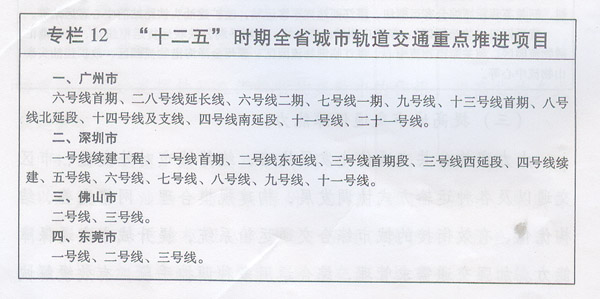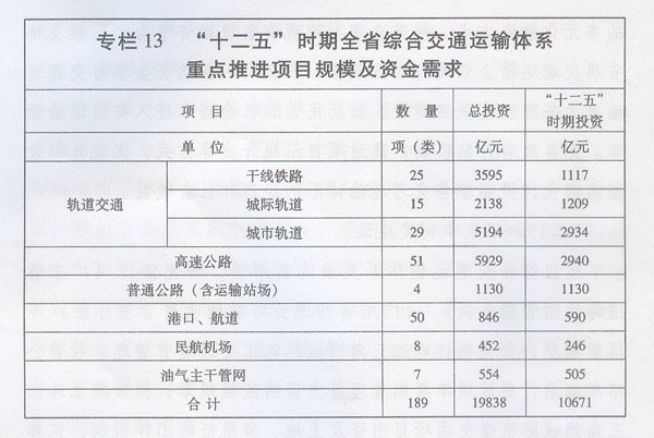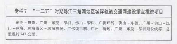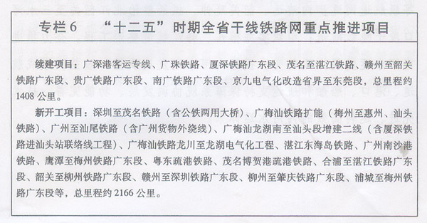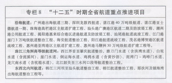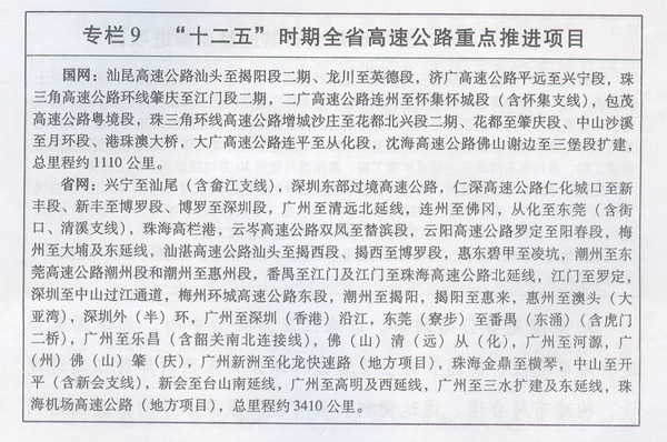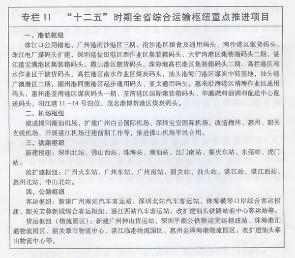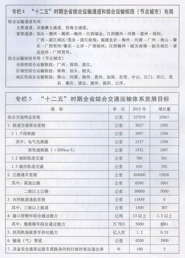 城际轨道交通。建成以广州、深圳、珠海为主要节点,连通珠江三角洲9个地级以上市及清远市区的珠江三角洲城际轨道交通网络主骨架,便利衔接铁路客运枢纽站、主要机场、城市轨道交通枢纽站、公路客运枢纽站,实现以广州为中心、主要城市间1小时互通。规划建设粤东地区城际轨道交通网。到2015年,珠江三角洲城际轨道交通营运里程约700公里。 2.积极推进航道建设。大力发展内河航运,改善全省航道等级结构和通达水平。加大内河出海口门航道开发力度,实施西江航运干线扩能工程,进一步完善珠江三角洲高等级航道网,基本形成西江干线至珠江口港口群的航运主通道;将珠江三角洲高等级航道网逐步向清远、韶关延伸,抓紧整治北江韶关至三水河口段千吨级航道;组织实施榕江、韩江航道整治工程。全力推进内河水运发展方式转变,提高内河水运发展质量和效益,形成航道、港口、船舶和航运支持保障系统协调发展、功能完善、技术先进、运转高效的内河水运体系。 3.继续完善公路网络。以珠江三角洲为中心,加快国家高速公路粤境段、高速公路出省通道和珠江口东西两岸跨江通道建设,构建布局合理、通达便利和具有较高服务水平的高速公路网络。 加强以国省道为重点的普通公路建设,提升国省道普通干线公路技术等级、通行能力和服务水平,打造国道和主要省道“养护管理示范路”,形成规模稳定、结构合理、连接完善的国省道普通干线公路网络,增强普通国道对全省县级以上行政中心节点的连接和覆盖。巩固发展农村公路,加强农村公路养护管理和升级改造,每年建设5000公里左右的社会主义新农村公路。 4.加快建设油气管网。结合气源项目建设,加快完善珠江三角洲天然气输送主干管网,推进粤东、粤西、粤北天然气主干管网建设,逐步完善全省天然气输送管网。到2015年形成连接各气源点,以珠江三角洲为中心,通达全省各地级以上市的天然气输送主干管网络。加快建设珠江三角洲成品油管道二期工程,积极推进湛江、揭阳炼化成品油送出配套工程和粤北成品油管道工程。结合新建、扩建炼油项目,配套建设原油运输管道;根据惠州、湛江原油储备库建设进度,配套建设连接储备库与炼油厂的原油管道。 (二)强化综合运输枢纽建设。 结合轨道交通网、高速公路网和机场、港口建设,加强节点城市综合运输枢纽建设,在广州、深圳和湛江等全国性综合运输枢纽城市,珠海、汕头和韶关等区域性综合运输枢纽城市以及其他地区性综合运输枢纽城市布局建设综合运输枢纽站场,使各种运输方式有效衔接,并与城市规划相协调,与城市建设相促进。 1.机场枢纽。完善以广州白云国际机场为国际复合型门户枢纽,深圳宝安国际机场为区域性枢纽机场,其他支线机场为补充的全省民用机场布局,加强广州白云国际机场的国际航空枢纽建设,提升深圳宝安国际机场国内客运和国际货运功能,加快支线机场建设。强化机场综合运输枢纽功能,继续加快建设广州白云国际机场和深圳宝安国际机场城际、城市轨道交通接入工程;在广州白云国际机场、深圳宝安国际机场和揭阳潮汕机场配套完善公路客运和公交站场;建成联系珠海三灶、揭阳潮汕等机场的高(快)速公路;完善深圳宝安国际机场水运码头功能;研究迁建湛江机场。加快通用航空机场布点与建设,构建全省通航服务网络、海洋综合服务网络和航空应急救援网络。 2.港航枢纽。推进港口资源整合,促进沿海港口集约化发展和港口群协调发展。进一步加强集装箱、煤炭、矿石、油品和粮食等专业化泊位建设,提高煤炭接卸码头靠泊能力和接卸效率,根据产业布局要求相应建设原油接卸码头,继续完善集装箱干线港、支线港和喂给港布局,形成高效率的内贸、外贸集装箱运输体系。大力发展公用码头,鼓励企业专用码头提供社会化服务,提升港口公共服务水平和岸线资源的使用效率。全面推进传统港口升级改造,提高港口岸线资源利用率。完善港口集疏运体系,发展多式联运,实现沿海重要港口通铁路、高等级公路。加强陆岛码头、防波堤、公共锚地等公共基础设施建设。在珠江三角洲沿海港口科学选址,择机建设邮轮母港,促进邮轮运输服务业发展。 3.铁路枢纽。加强铁路和城际轨道交通综合枢纽站场建设,在铁路和城际轨道交通客运站配套建设公路客运、公交站场和城市轨道交通站场,与公路、城市轨道交通、城市公交等实现便捷衔接。围绕城市空间布局和产业发展,加强铁路综合货运枢纽站场建设,充分发挥铁路在港口货物集散中的作用,提高货物多式联运效率。 4.公路枢纽。组织实施广(州)佛(山)、深(圳)(东)莞以及珠海、汕头、韶关、梅州、江门、湛江、茂名、肇庆等10个国家公路运输枢纽总体规划。新建、改扩建一批公路客运枢纽站场,加强公路客运枢纽与轨道交通、城市公交等运输方式的衔接,进一步提高公路客运枢纽站场的服务水平和覆盖面。结合产业结构布局,积极推进公路货运枢纽站场和现代化物流园区建设,提升物流服务水平。 (三)提高城市交通保障能力。 大力实施公共交通优先发展战略,统筹城市对外交通、市区交通以及各种运输方式协调发展,构建规模合理、网络完善、结构优化、有效衔接的城市综合交通运输系统,提升城市交通保障能力。加强交通需求管理,综合运用多种调控手