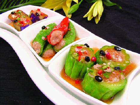 东江酿三宝(客家酿三宝)是将酿苦瓜、酿辣椒和酿茄子集于一盘,色泽各异,形态美观,味道独特。酿菜是客家常见的烹饪方法,有酿豆腐、酿茄子、酿苦瓜等。