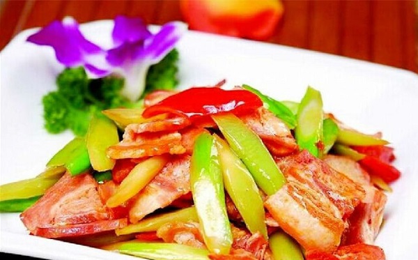 5、蒜瓣爆香,加烟熏肉炒至烟熏肉脆;