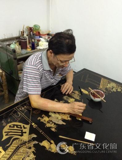 顾名思义,潮州推光金漆画是在推光漆板上用金粉和金箔创作的画。其创作要在光素的漆面上,用红漆按需要绘好画面,待红漆将干而未全干略带黏感时贴上金箔或涂抹金粉后,再用特制的铁笔在画面上刻划出人物、山水、器物等的轮廓和细部,使画面呈现金碧辉煌的艺术效果。潮州推光金漆画制作过程分实木板制作、漆板制作、金漆画绘制三大部分。首先,选用杉木作为制作实木板的木材,经切割、粘合、拼接、打磨等工序制作出实木板。接着,在做好的实木板上,用木屑将木板上原有的裂缝和空洞填满并磨平,再进行三次的刮漆灰、荫干、打磨,上漆、擦漆、推广最后制成漆板。然后,在漆板上画线稿、金地漆勾勒、贴金线。最后,按人物、建筑、植物、山石的顺序绘制金漆画,绘制后运用铁笔对整个画面进行深入刻画。